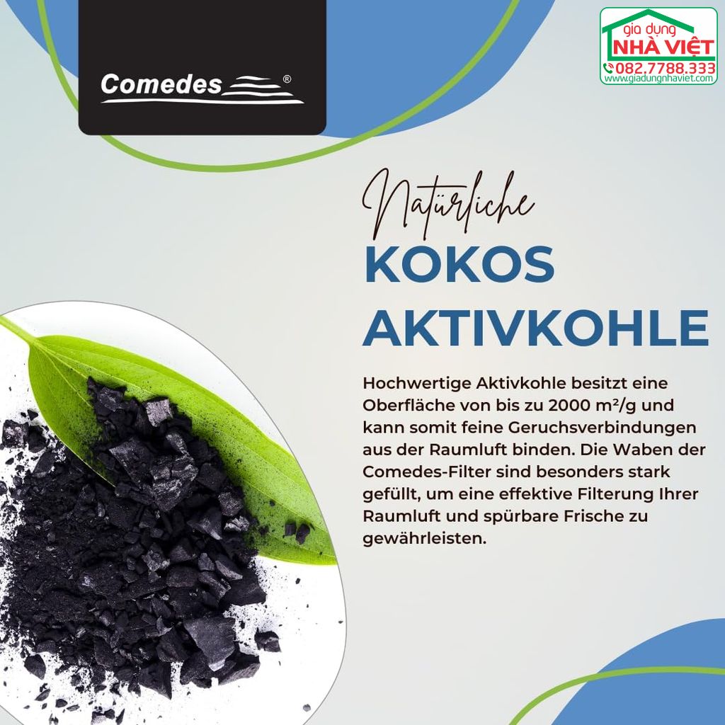 Bộ lọc than hoạt tính của Comedes là bộ lọc hạng nhất có diện tích bề mặt lên tới 2000m2 mỗi gram. Giống như một miếng bọt biển, chúng có thể loại bỏ mùi nấu ăn khó chịu, các hạt mùi tốt nhất và nhiều loại hợp chất từ ​​không khí trong phòng.