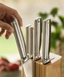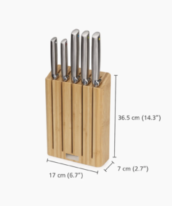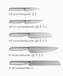 - Bộ sản phẩm bao gồm dao gọt 9 cm, dao răng cưa 11 cm, dao Santoku 14 cm, dao đầu bếp 20 cm và dao cắt bánh mì 20 cm.