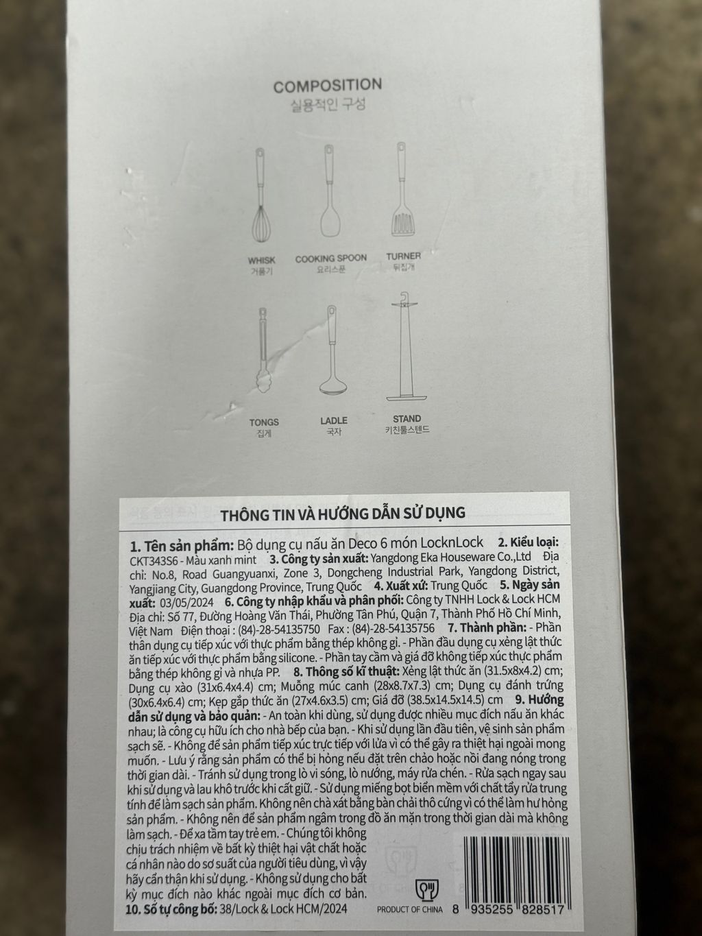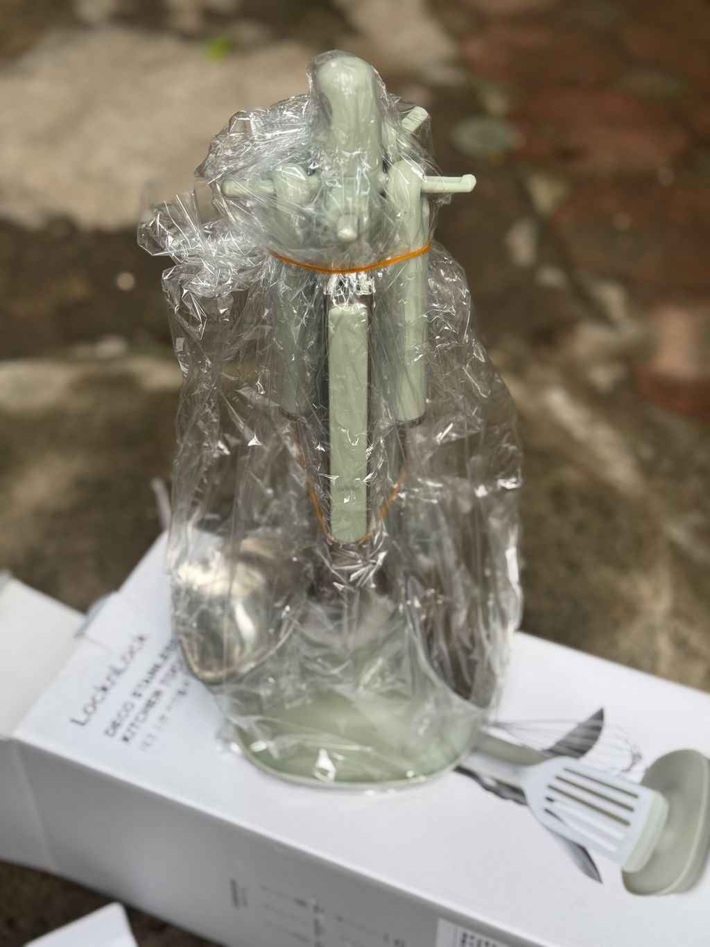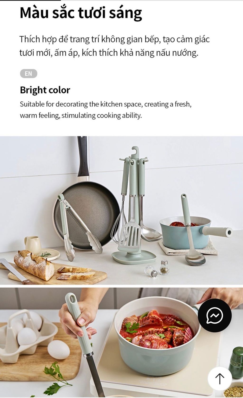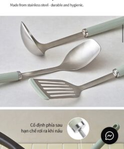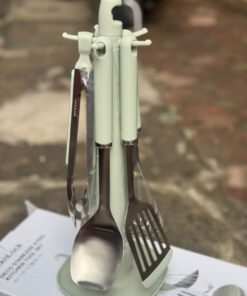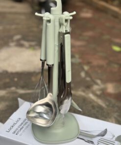 - Bộ 6 món đầy đủ gồm xẻng lật, dụng cụ xào, muỗng múc canh, dụng cụ đánh trứng, kẹp gắp thức ăn và giá treo tiện dụng.