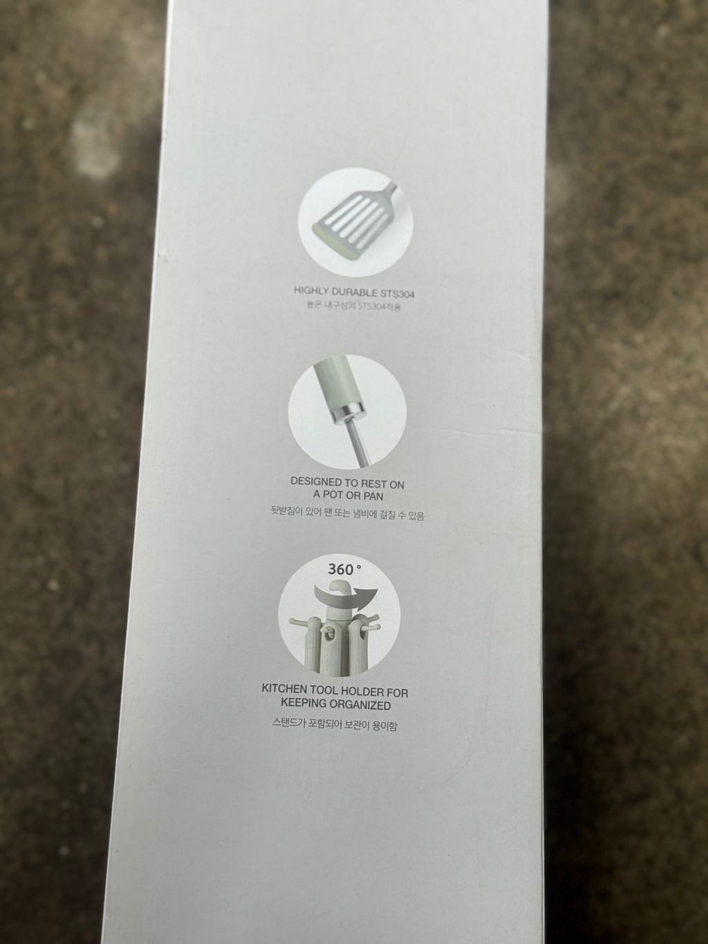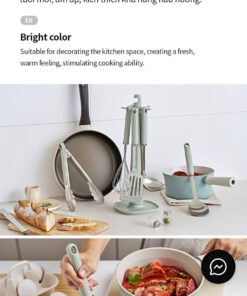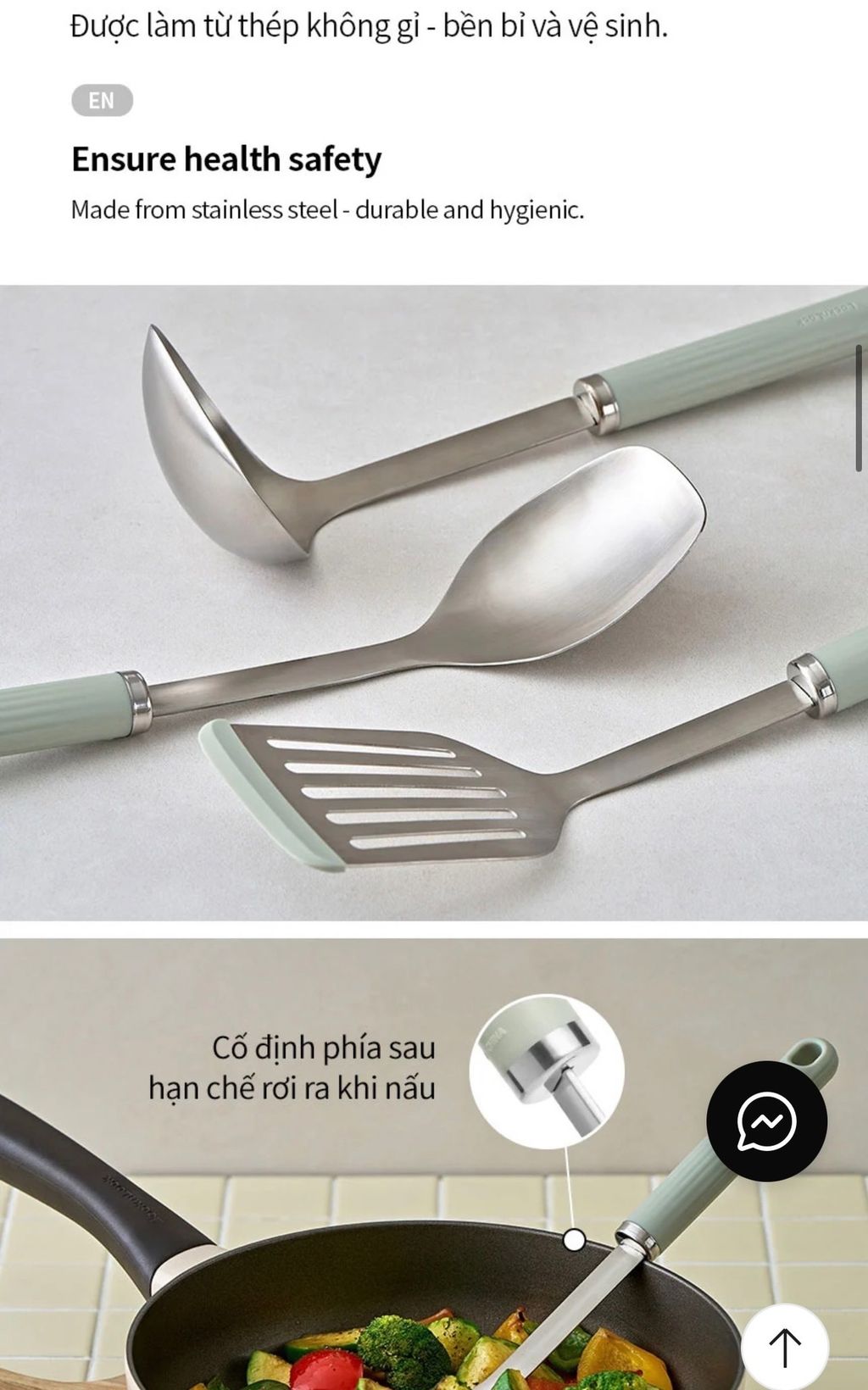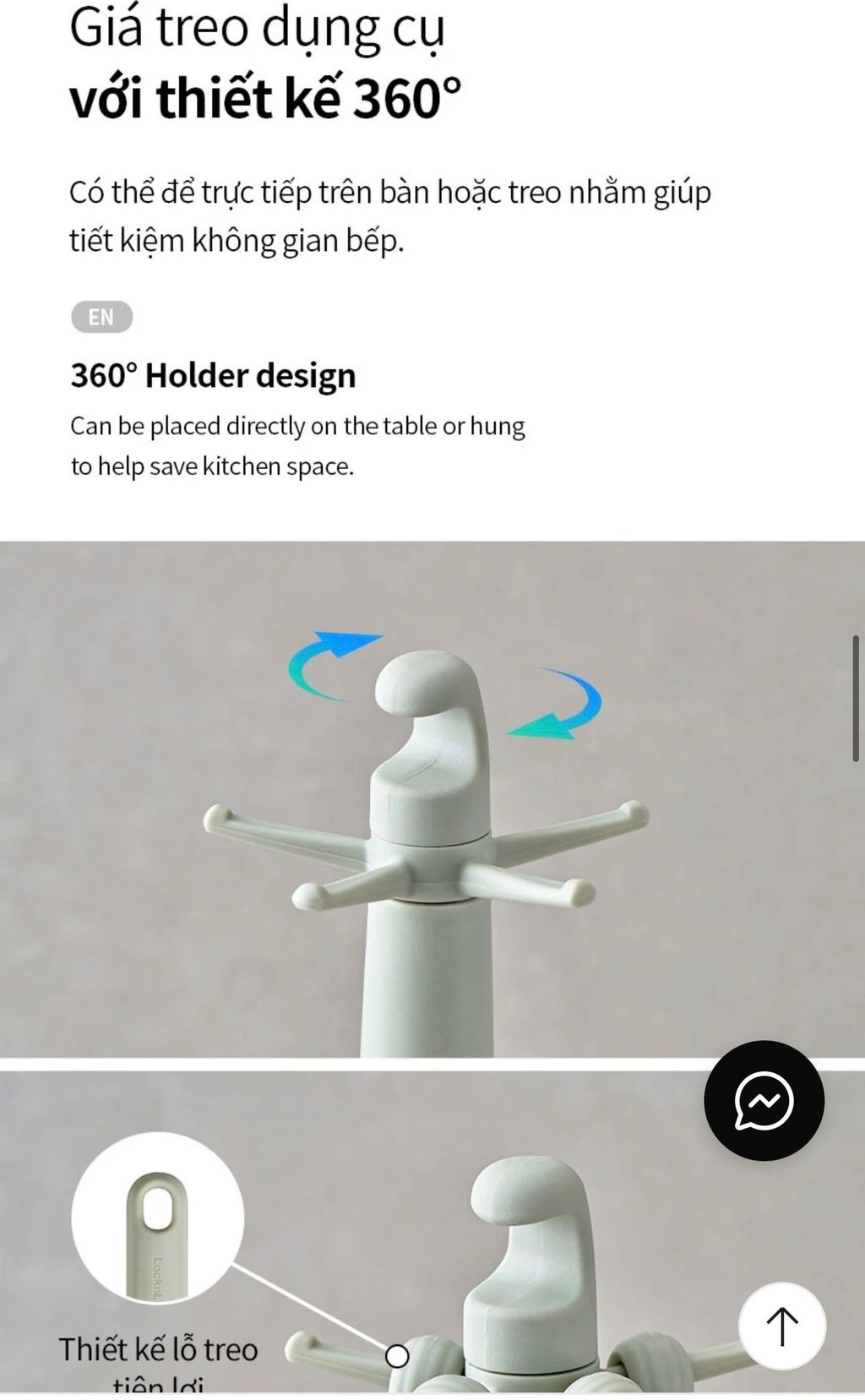 - Bộ 6 món đầy đủ gồm xẻng lật, dụng cụ xào, muỗng múc canh, dụng cụ đánh trứng, kẹp gắp thức ăn và giá treo tiện dụng.
