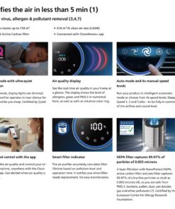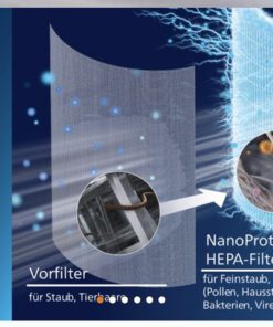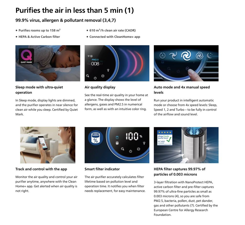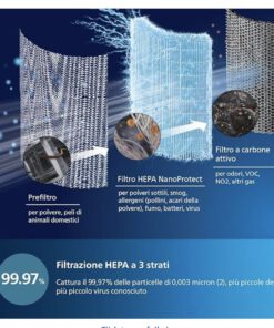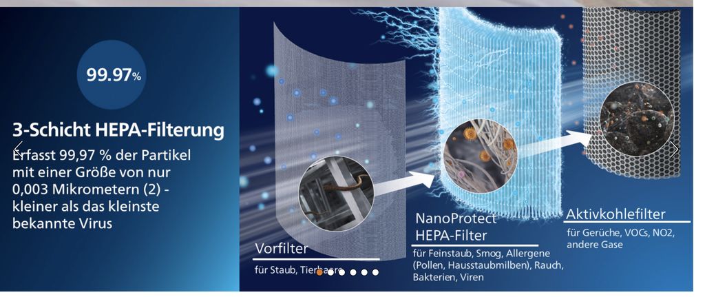 Lọc 3 lớp với NanoProtect HEPA, bộ lọc than hoạt tính và bộ lọc sơ cấp lọc được 99,97% các hạt siêu mịn có kích thước nhỏ tới 0,003 micron (4), vì vậy bạn sẽ an toàn trước bụi mịn PM2.5, vi khuẩn, phấn hoa, bụi, lông thú cưng, khí gas và các chất ô nhiễm khác (7). Được chứng nhận bởi Trung tâm Nghiên cứu Dị ứng Châu Âu.