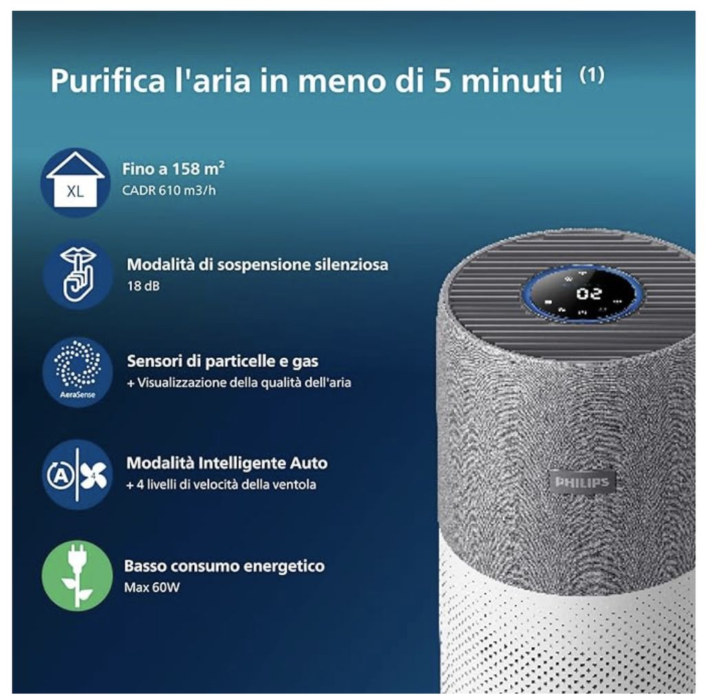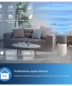Luồng gió 360° bao phủ hiệu quả các phòng có diện tích lên đến 158 m² và phân phối không khí sạch đến mọi ngóc ngách của phòng. Điều này giúp tăng hiệu suất lên đến 610 m³/giờ (2) CADR (Tốc độ phân phối không khí sạch). Máy có thể làm sạch 20 m² chỉ trong 5 phút. (1)