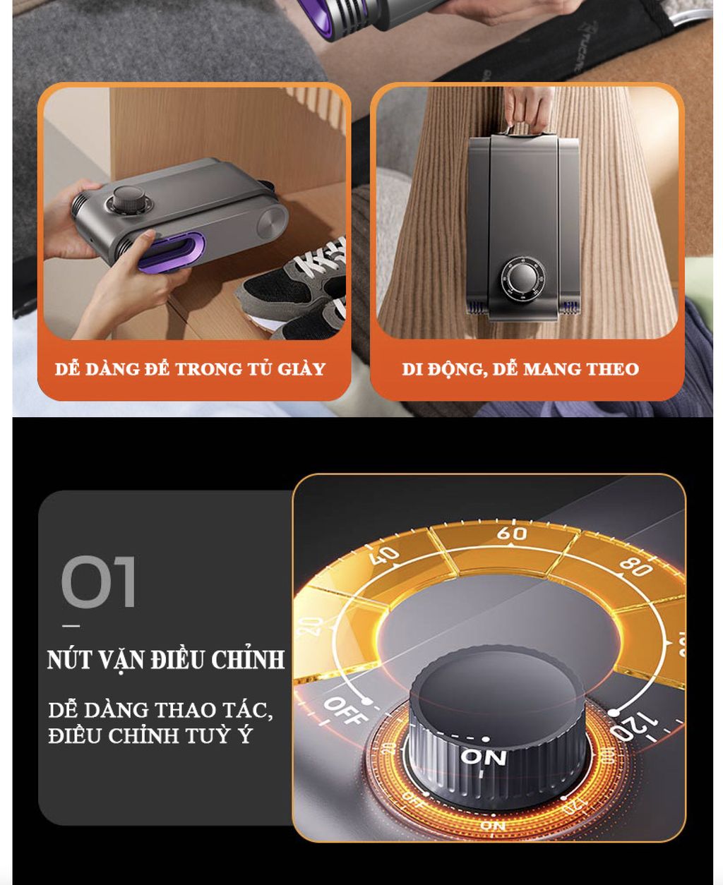Hẹn Giờ Linh Hoạt: Có thể cài đặt hẹn giờ từ 1 đến 120 phút, dễ dàng điều chỉnh theo nhu cầu và loại giày dép cần sấy.