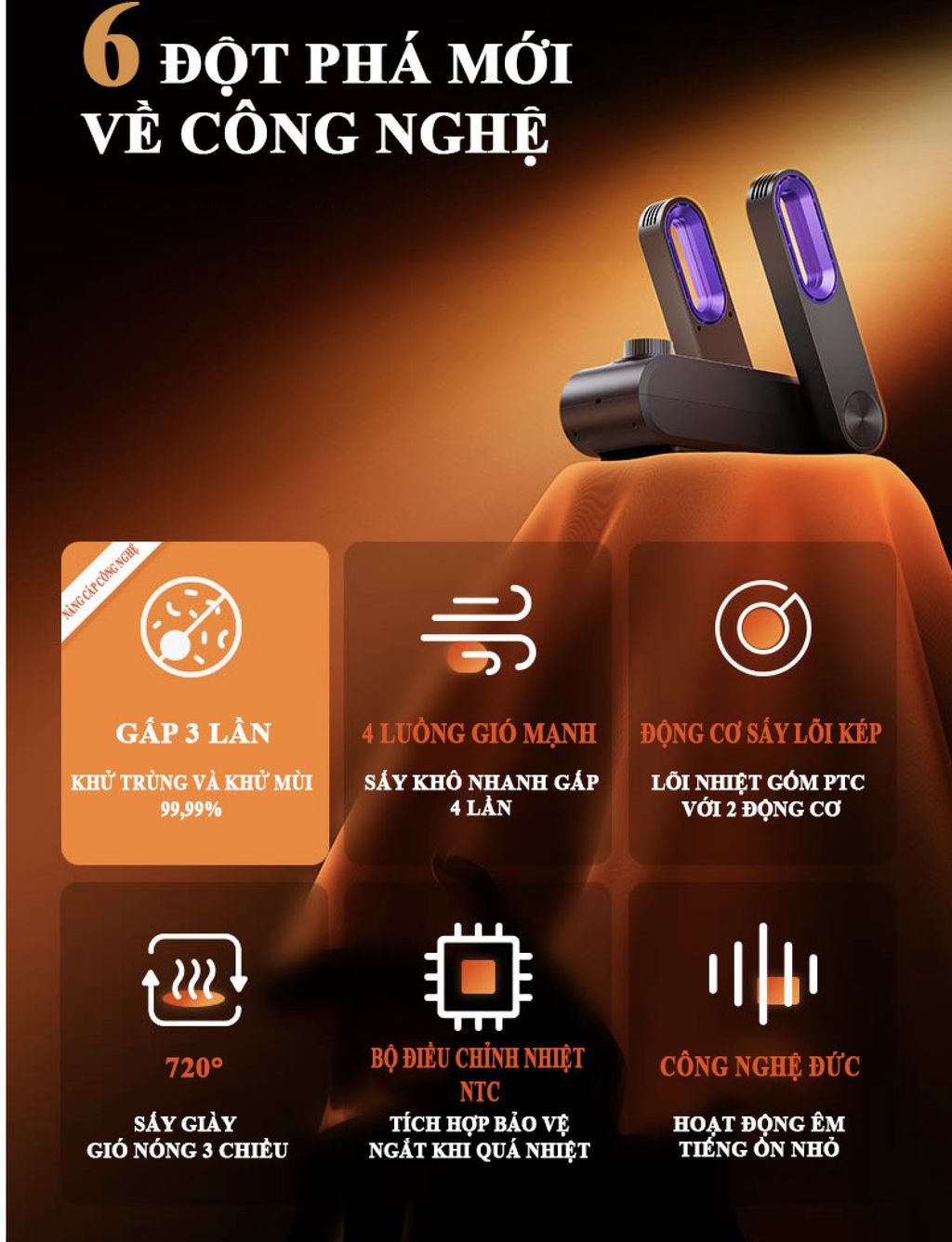 Bảo vệ giày: Sấy khô nhẹ nhàng mà vẫn đảm bảo giày không bị hư hại do nhiệt độ cao hoặc sấy quá lâu.