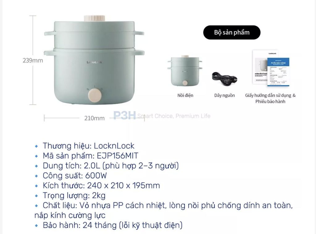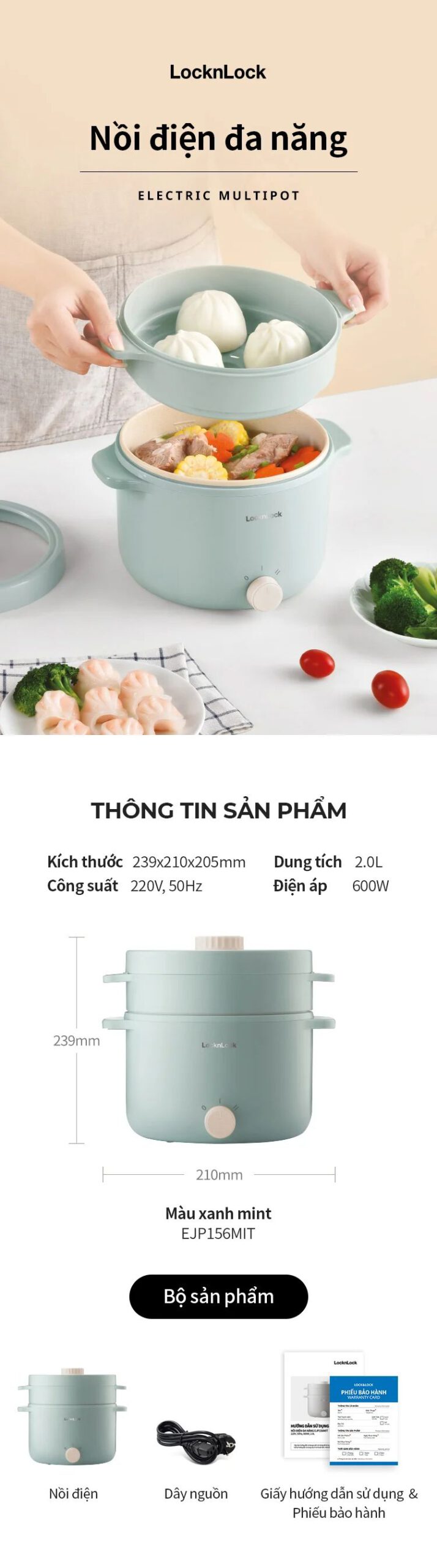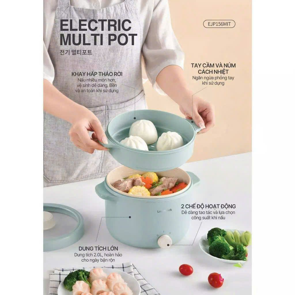 | Tên sản phẩm | Nồi Điện Đa Năng LocknLock Electric Multi Pot 220V, 50Hz, 600W, 2.0L – Màu Mint – EJP156 |