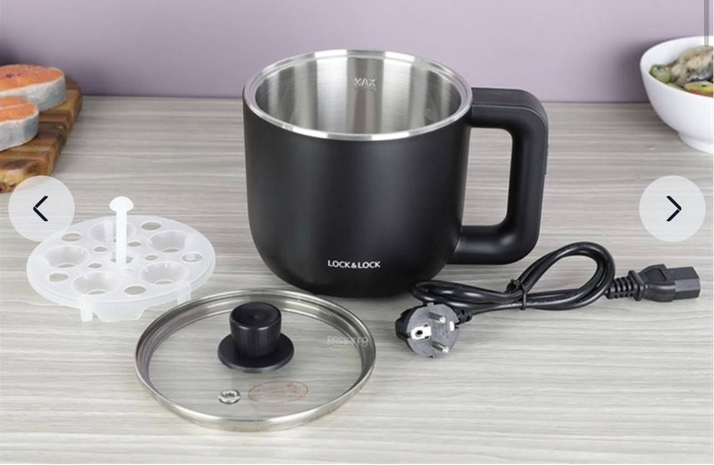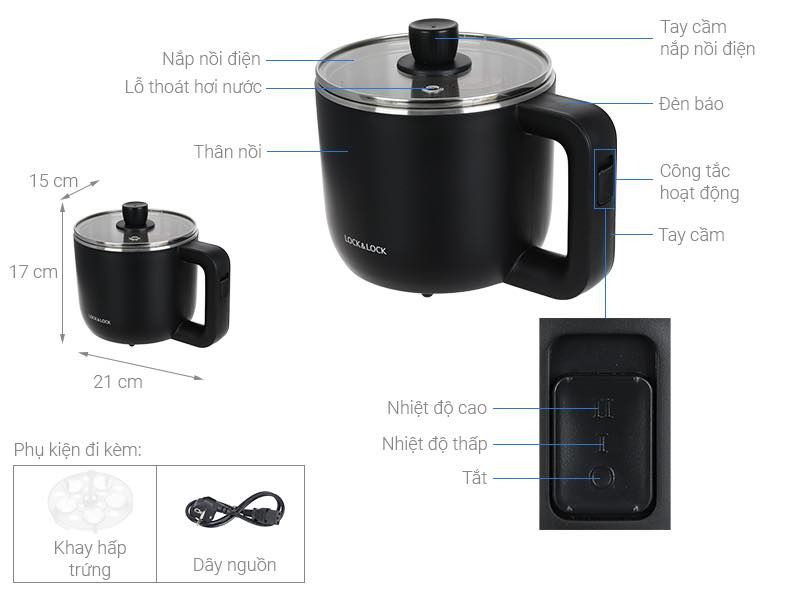 Dung tích 0.8 lít thích hợp sử dụng cá nhân.Vỏ nồi bằng nhựa PP cách nhiệt và cách điện tốt, lòng nồi bằng inox 304, bền đẹp, dễ vệ sinh.Điều khiển bằng nút gạt đơn giản, dễ dùng.Có tay cầm chống nóng, khay hấp trứng tiện dụng, dây điện tháo rời dễ bảo quản sau khi sử dụng.Thương hiệu Lock&Lock – Hàn Quốc, sản xuất tại Trung Quốc.