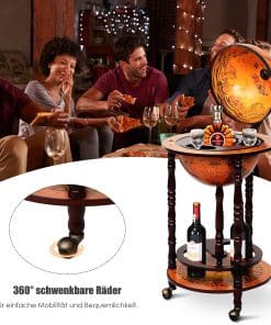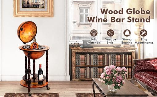 ● Không gian lưu trữ lớn: Cung cấp đủ không gian cho chai rượu và ly rượu. Ngoài ra còn có một tấm đế bằng gỗ dưới quả bóng, trên đó có không gian cho các vật dụng khác.