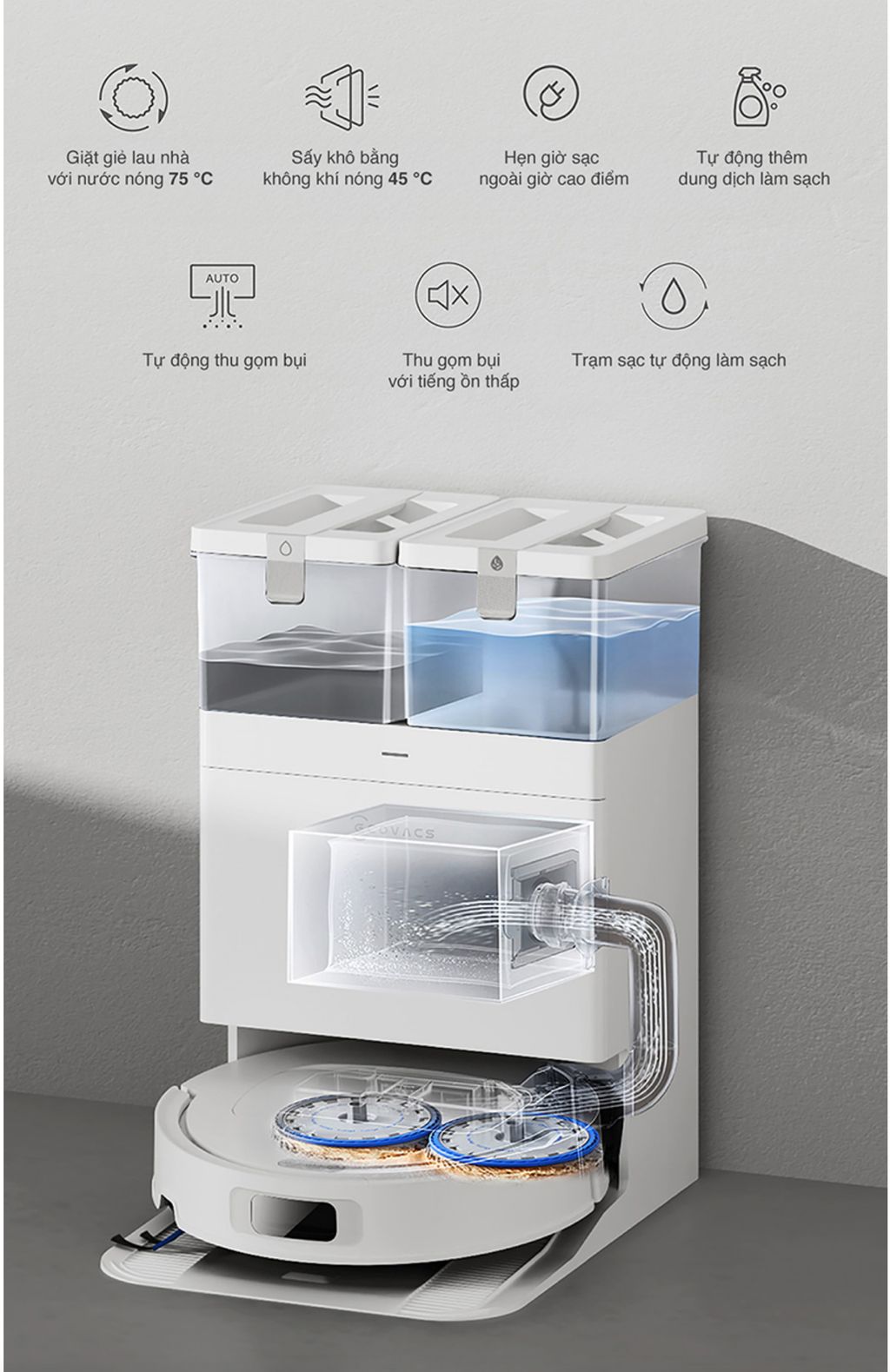 Lấy cảm hứng từ phong cách tối giản, robot Deebot T30C sở hữu ngoại hình tinh tế, sang trọng phù hợp với hầu hết không gian sống hiện đại. Thiết kế này vừa đảm bảo hiệu suất làm sạch tối ưu, vừa giữ được tính thẩm mỹ cho không gian nội thất. Đặc biệt, việc đổ nước bẩn, thêm nước sạch vào bình chứa rất thuận tiện, bạn chỉ cần nâng nhẹ bình lên 5cm, mà không cần phải di chuyển toàn bộ trạm sạc.