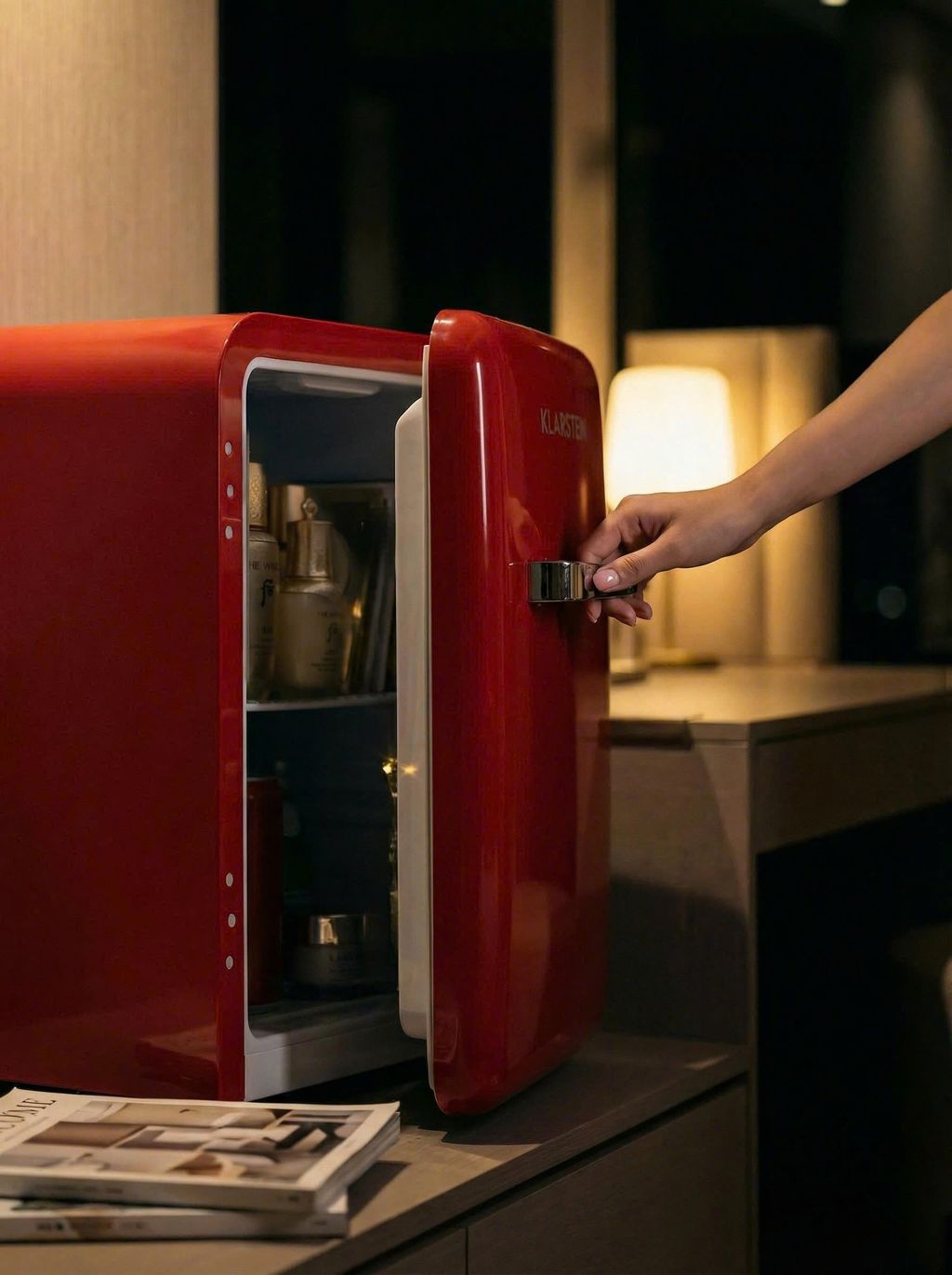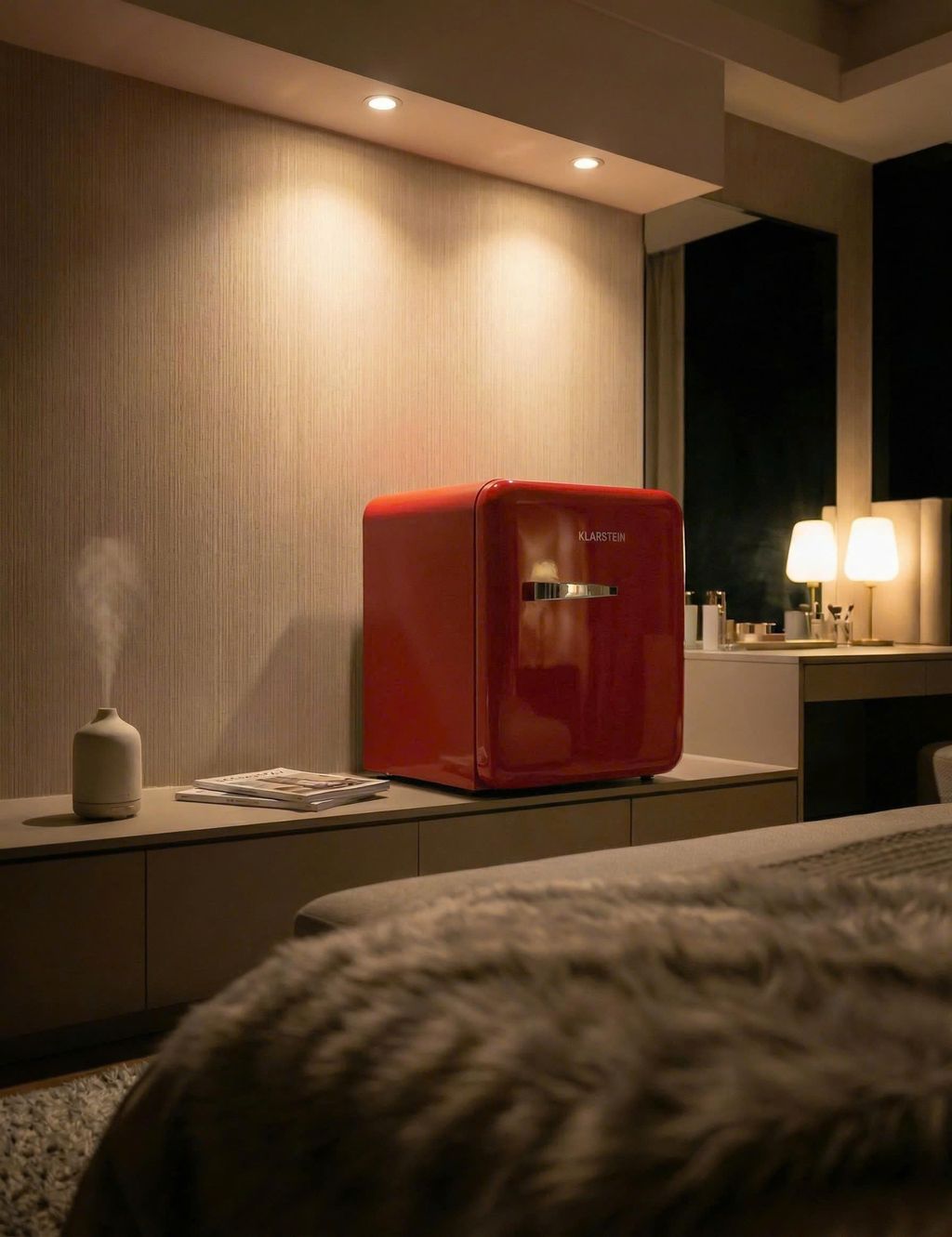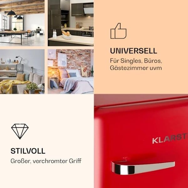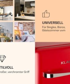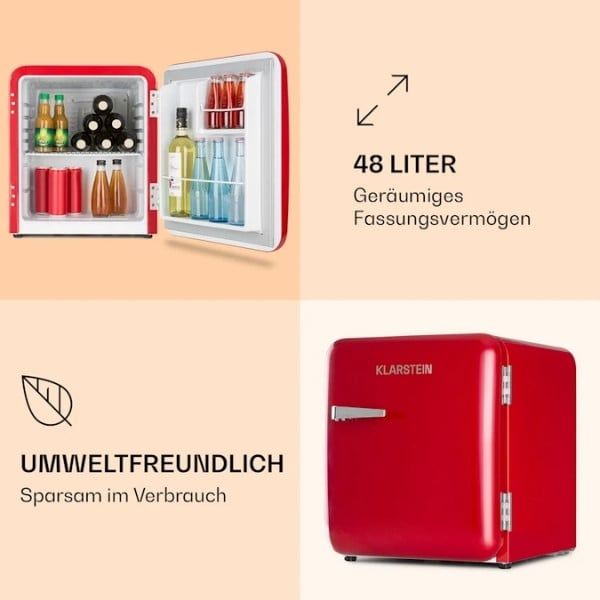 Ướp lạnh đồ uống với màu đỏ sang trọng: Tủ lạnh Klarstein Audrey Mini Retro 48L làm lạnh rượu và đồ uống ở nhiệt độ lý tưởng và nhờ kích thước nhỏ gọn, phù hợp cho những ngôi nhà nhỏ, phòng giải trí, văn phòng hoặc phòng khách sạn.