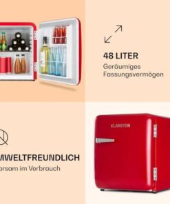 Tủ Lạnh Klarstein Audrey Mini Retro 48L – Màu Đỏ với dung tích sử dụng được là 48 lít cung cấp nhiều không gian cho nhiều loại đồ uống, rượu mạnh và đồ ăn nhẹ. Hai ngăn cửa có thể để các loại đồ uống và được lưu trữ để làm mát theo yêu cầu, đầu ra làm mát có thể được đặt từ 0 đến 10°C.